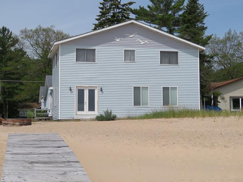 This lake home is a perfect blend of old and new, providing character and convenience. The original home features T&G pine with cathedral-vaulted ceilings in both the dining area and stairway nook. The addition features great views of the lake with an open living area on the main floor spanning from the dining to the lakeside patio door. Full view French style doors open into what the family refers to as the the library; featuring a lakeside view on one side with library shelving on the opposite wall. There is a main floor bedroom, bath, and utility area; with two large lakeside bedrooms and a full bath on the second floor. The attached two car garage provides plenty of storage. Just wait until you sink your toes into the sugar sand beach! Walk the shoreline or relax and enjoy. Owner will consider selling turn key.