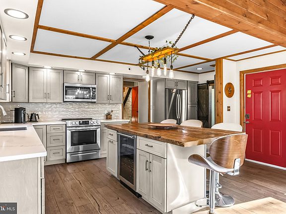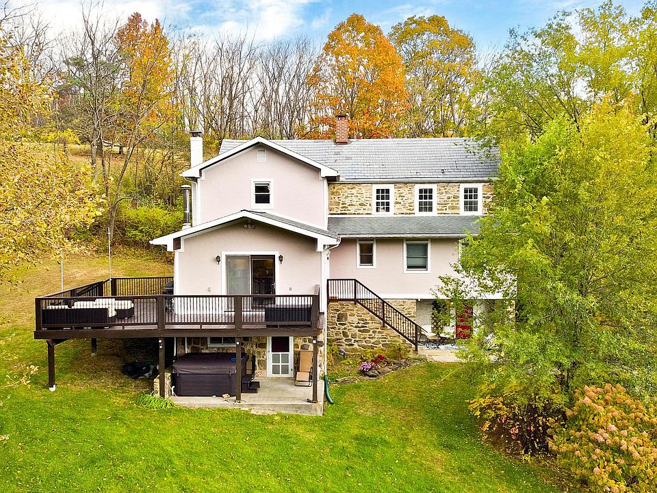 On seven secluded acres in the hills above the valley, this country estate offers a rare fusion of heritage, design, and modern lifestyle—anchored by a refined main residence and an accessory building across the courtyard offering a striking loft-style interior, thoughtfully modern and well suited for an office, creative studio, or serene relaxation space. Founded in 1839, the home’s history is expressed through its stone bones and dramatic timberwork—updated with a modern sensibility that respects the original craft. The looping drive approaches the home as the hill behind it rises into an overlook with sweeping valley views reaching toward South Mountain, a horizon that shifts with the seasons. The façade blends weathered stone and timber, setting the tone for interiors defined by texture, light, and thoughtful design. The living room is exceptionally warm—rich timber beams, wide-plank floors, a wood-burning fireplace, and an original Pennsylvania Dutch door give the space a grounded, tactile comfort. Adjacent to the kitchen, the dining room maintains an intimate connection between the home’s earliest gathering spaces and its reinterpreted culinary center. A large, custom, light-filled kitchen introduces clean lines and beautiful cabinetry, with expansive windows on three sides opening the room to sweeping views of the property. Designed as the home’s natural gathering space, it flows directly onto a wide wraparound deck that extends the living area outdoors and frames the landscape in every direction. Downstairs, a speakeasy-style bar brings a moody, intimate atmosphere, echoing the elegance of another era. This level can also function as a self-contained studio, complete with its own separate entry, entertainment lounge, full bathroom, and kitchenette, creating a flexible and unique guest suite distinct from the main home. This area also includes a dedicated gym and sauna, with direct access to the hot tub just outside, reinforcing the estate’s seamless indoor–outdoor flow. Across the courtyard, a 720 sq ft repurposed historic structure houses the striking loft-style interior—a modern, light-filled environment thoughtfully embedded within the original stone envelope. The space features clean lines, softened industrial details, an elegant kitchen, and a powder room, creating a refined and versatile setting for work, creative pursuits, or quiet retreat. The ground level retains its barn-like character and serves as a versatile garage or workshop, while the upper level functions as a polished architectural workspace or personal sanctuary. Together, these buildings form a cohesive estate experience—one that blends history and contemporary design in a setting defined by landscape, craft, and privacy. This is a rare offering in the Lehigh Valley: a country estate that is both architecturally distinctive and effortlessly livable.