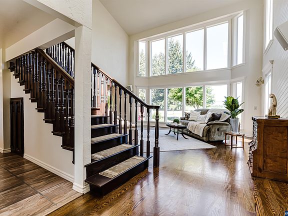 One owner, lovingly maintained small acreage, level lot in desirable location. 4J School District. Soaring ceilings & floor to ceiling windows greet you as you enter this home. Well laid out floor plan that allows for separation of space. Kitchen w/breakfast nook, custom cabinets & granite counters & updated stainless appliances. Primary bedroom w/bath, double closets & cultured marble shower. East wing w/3 bedrooms & a full bath. Family room has slider that leads to back yard paver patio.