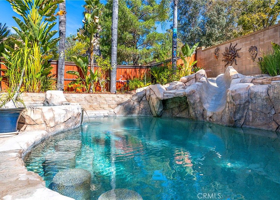 Luxury and entertaining come together in this incredible oasis! Perfect for the party host who dreams of poolside parties and backyard barbeques, this home packs a punch! Featuring a fully hardscaped front yard equipped with extra seating, two types of paid off solar panels, a whole house fan, and a customized pool complete with a private pool with custom slide, swim up bar, built in BBQ, hot tub, and patio cover, you and your guests will never be short of excitement. You'll fall even more in love with this home when you step into the converted bar/additional kitchenette! This room is complete with a wine fridge, sink, trash compactor, and room for an additional full size refrigerator. With everything you could ever need for entertaining, this house truly is an entertainer's dream! Head to the master bath where you'll find an extra large shower with dual shower heads for extra relaxation. Enjoy all the community amenities including multiple pools & spas, walking paths, parks, and more! Don't miss your chance to own luxurious paradise - it won't be around for long!