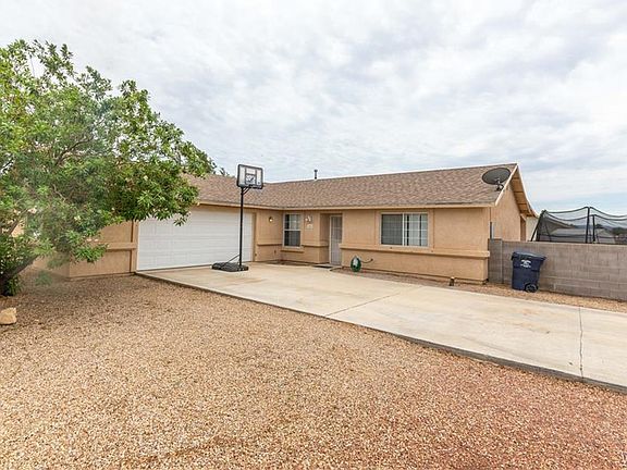 MAKE THIS HOUSE YOUR HOME! Three bedroom 2 bathroom home with LARGE oversized 2 car garage on corner lot. This home welcomes you with open arms and fully landscaped front yard with easy care rock and mature trees. The "L" shaped layout has extra long concrete driveway for visitors, stucco exterior and shingle roofing. Enter the front door into the living area with vaulted ceilings, window coverings and ceiling fan. This loops around to the open kitchen which features tile flooring, good-sized pantry, solid-surface counter tops, breakfast bar for extra seating, and plenty of oak wood cabinetry for extra storage. Also includes dishwasher, disposal, electric oven/stove & hooded microwave. Kitchen opens up into the casual dining area which also includes tile flooring as well, glass slider to the covered patio, vaulted ceilings and ceiling fan. Down the hallway you will find 2 guest bedrooms, both standard size again with ceiling fans and nice-sized closets with high/low shelving in each. The guest bathroom is bright and has tile flooring, tub/shower combo. Master bedroom is a great size to accomodate a king-size bed easily and furnishings, with ceiling fan & window coverings also. Master bathroom has plenty of storage space on the solid-surface countertop and large vanity, also features tub/shower combo, & tile flooring. The 2 car garage is completely oversized -with plenty of space on either side of the automatic door for extra storage. Washer and dryer hookups are in the garage. The backyard features a large covered patio, storage shed and a large back yard AND equally large side-yard completely enclosed by a private block wall fence. Metal storage shed also conveys with the property. Call today for your own tour!