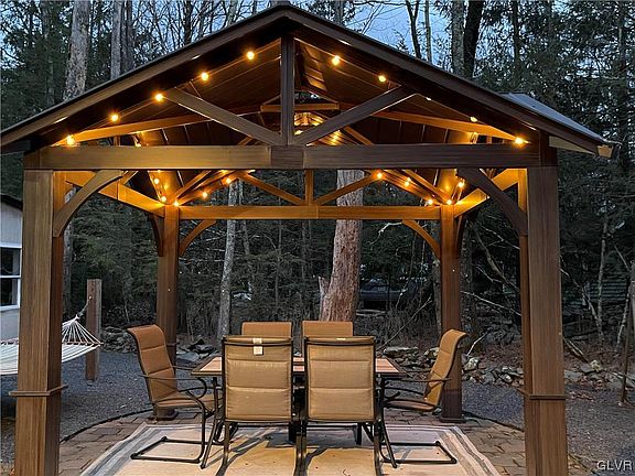 Immaculately kept single detached home is a must see!! Close to the resorts and skiing in the Pocono Mountains, the outlets in Tannersville there is something for everyone close by. Commuters will find close easy access Int 80, Rt 209 & Rt 402. This property has an above ground pool with deck 2020, hammock 2020, and lighted gazebo 2022, with separately fenced in areas. The front deck opens to a hallway with a mudroom/office on the right. The larger living room has a free-standing fireplace which will heat the entire home efficiently. The kitchen has an eat in area with a side outside entrance to the front deck which wraps around from the front. The bathroom has washer/dryer hookups next to a nice sized master bedroom.