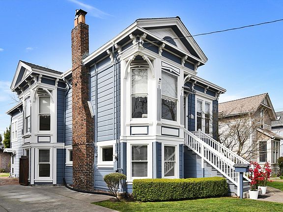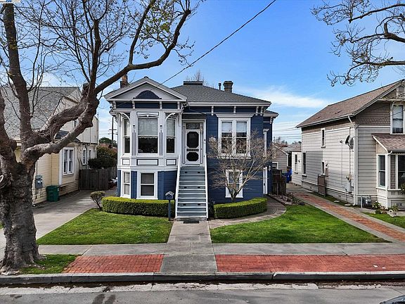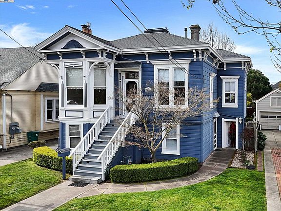 This stunning Queen Anne Victorian residence welcomes you, with its timeless charm and modern updates. Located in Alameda's desirable East End, this bright and spacious home was built in 1890 with high-coved ceilings and original architectural details, preserving its historic character. The upper main level features stunning original hardwood floors and built-in cabinets and is freshly painted throughout. The spacious kitchen boasts new luxury vinyl flooring and a delightful breakfast nook with a view and a large eat-up island with a butcher block countertop. The upstairs layout is warm and elegant with a formal living room, dining room, three bedrooms, and two bathrooms. This home is a dream for gardening enthusiasts. The lovely backyard features a fruitful orange tree, a vegetable bed, vibrant flowers, and a large brick patio area creating a serene outdoor space perfect for relaxing and entertaining. This 4-bedroom, 3-bathroom has recently been used a single-family home for a large multigenerational family and it is designated as a duplex. The lower level offers 1-bedroom, 1-bathroom, and its own kitchen. It has its separate entrance and laundry hookups. Don't miss this rare chance to own a bright, spacious and inviting Queen Ann Victorian in Alameda's sought-after East End!