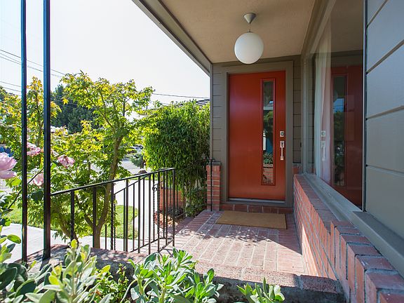 Built in 1956, this classic mid-century home sits in a quiet residential neighborhood in Alameda’s East End. Situated within walking distance of Otis Elementary School and Lincoln Middle School, this single level home features three bedrooms, two bathrooms, a large kitchen/family room combo, an open living room/dining room, and an attached garage. The home’s exterior has a stucco façade with brick trim, and a roofline with understated, broad gables. Stairs lead up to a covered brick entry porch, and the original wrought iron railings and an oversized picture window give the house a distinctive 1950s look and feel. The new Therma-Tru front door with new hardware is energy efficient, yet has a retro appearance with an inset side glass panel. Mature roses grow in the front and the entire side of the house, offering lovely views from inside the house as well as outside. The front door opens to a tiled, formal foyer with a diamond-shaped, fixed opaque-glass window. The spacious living and dining room area features a large, fixed picture window, a beautiful parquet oak floor, and a wood-burning fireplace with a brick surround and hearth. Two gallery walls are perfect for displaying art or photos, and casement windows on either side of the fireplace bring plenty of natural light into the room. The large kitchen/ family room is adjacent to the dining room, and has a ceramic tile floor for easy maintenance. The space is bright and airy with oversized windows that look out onto greenery. The kitchen features granite counters, plenty of cabinets and fresh paint, and opens directly to the family room. The washer and dryer are conveniently located in this easily accessible area, as is access to the attached garage. A hallway off of the kitchen has a coat closet, as well as utility and linen closets, and leads to the bedrooms and bathrooms at the back of the house. The hardwood floors in the hallway continue into each of the three bedrooms, and have been recently refinished. The first of two full bathrooms is situated between two bedrooms at the end of the hall, and has a ceramic tile floor, a window for ventilation and light, built-in linen cabinets, a wood vanity with a Corian top, and a shower over the tub. The bedroom to the right is bright and airy with sliding doors that open to the landscaped back yard, while the master suite has windows on two walls for plenty of light, and inviting views of the mature and leafy citrus trees in the rear garden. The en suite master bath includes a shower stall, a window with opaque glass, and a wood vanity with a Corian top.