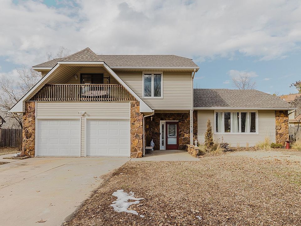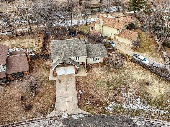Experience riverside living at its finest in this distinctive home nestled along the Little Arkansas River! The inviting floor plan showcases a spacious living room, formal dining area, and a bright eat-in kitchen featuring white cabinetry, tile backsplash, and a charming bay window overlooking the tree-lined backyard. The main floor family room is a standout space, complete with a built-in dry bar and office area, connecting seamlessly to the backyard through a sliding glass door. Upstairs, discover three well-appointed bedrooms, including a generous master suite with a ensuite bathroom – featuring a soaker tub, separate shower, and dual sinks. The master retreat offers a walkthrough closet connecting to another bedroom, an additional closet, and a private balcony with peaceful views of the backyard and river. The second bedroom boasts its own private balcony and dual closets, while the main bathroom impresses with tile work and a large vanity. Below, the partially finished basement provides excellent storage solutions or hideaway. The fenced backyard creates a private retreat with a lovely patio perfect for entertaining. Do not miss out on this great property located on a quiet cul-de-sac and on the Little Arkansas River!