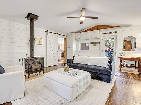 Seeking a bit of space and seclusion, a serene property with a babbling brook, and an utterly charming move-in-ready home? This is it! Welcome to your special oasis where the beauty of nature surrounds you. This 8+ acre property features a peaceful and very private setting with a lovely year-round stream running through it. Inside you will find the remodeled modern farmhouse interior where every room is a delight and exudes comfort and charm. Quality abounds! The living room is warm and inviting with hardwood floors, big windows and a cozy fireplace. The remodeled kitchen is a stunner with gorgeous granite, farm sink, bar seating, walk-in pantry closet and room for dining. Sunshine abounds through the many windows. Head out back to the spacious covered deck and immerse yourself in the natural surroundings, or head to the hot tub for an evening under the stars. Upstairs find the spacious primary suite, walk-in closet, lovely bathroom and extra bedroom/office. Excellent internet makes it easy to work from home. Step outside the primary suite to the large sunny deck…sleep under the stars here! The deck has access to a fenced area for your pets with a darling chicken coop. For that morning coffee or evening wine, relax by your own private creek whose soothing sounds can be heard from your open windows. Outdoor living abounds whether it's enjoying al fresco dining on the picnic deck by the creek and gathering by the fire pit, dining on the home’s flagstone patio or upper deck, or hiking your 8 acres. The property also features a two car carport and storage/workshop building. Beyond your oasis there is an abundance of very close-by trails, from Maxwell Falls to Arapaho National Forest. Easy access to downtown Evergreen too. A2 zoning and no HOA. This is truly a rare find, a special sanctuary that beckons tranquil mountain living, but with all the modern comforts. Furniture negotiable. See more photos, 3D tour and floor plans at www.32696SaintMorizDrive.com