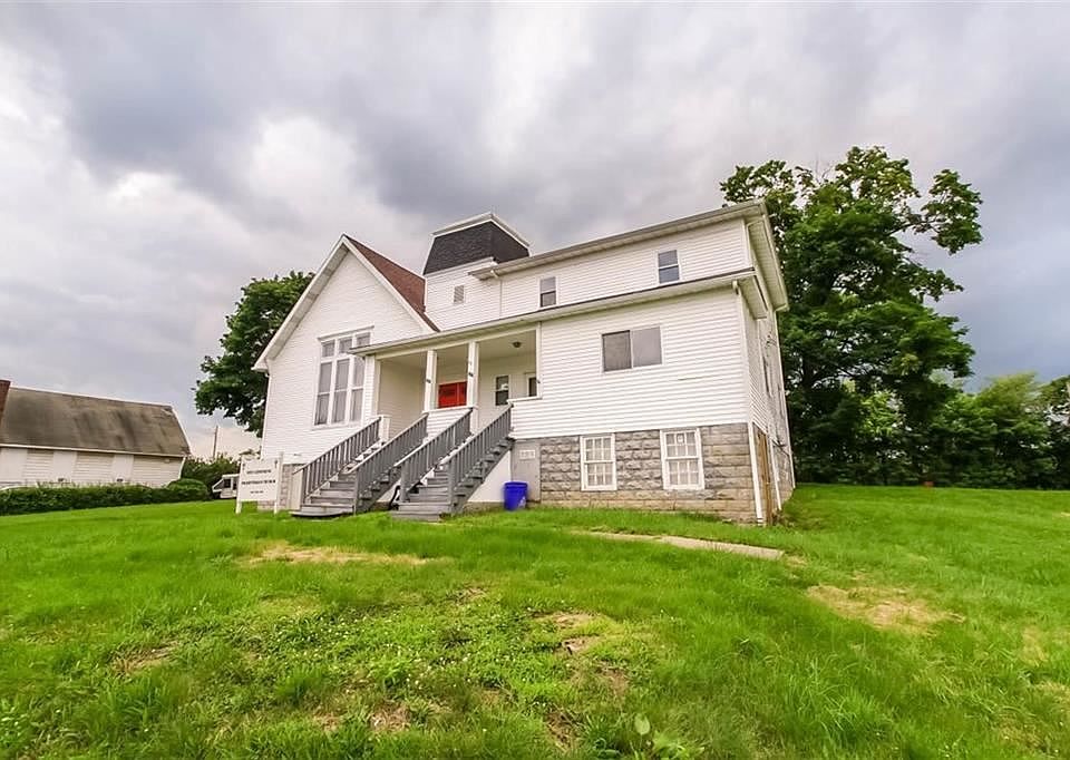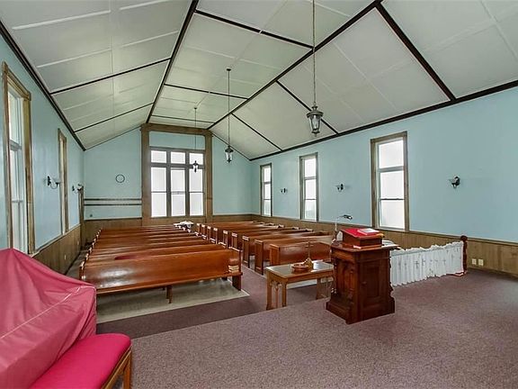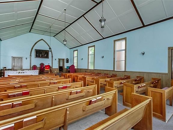 Church with huge open space on 1st floor and basement, newer breaker box and wiring, newer furnace, newer windows. Attached 3 bedroom 1.5 bath residence has newer windows, some large closets, high ceiling in basement and large bathroom with lots of potential. Big yard with mature trees and hilltop views!
