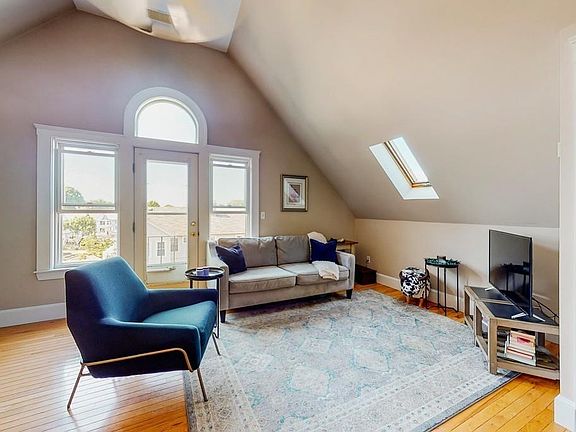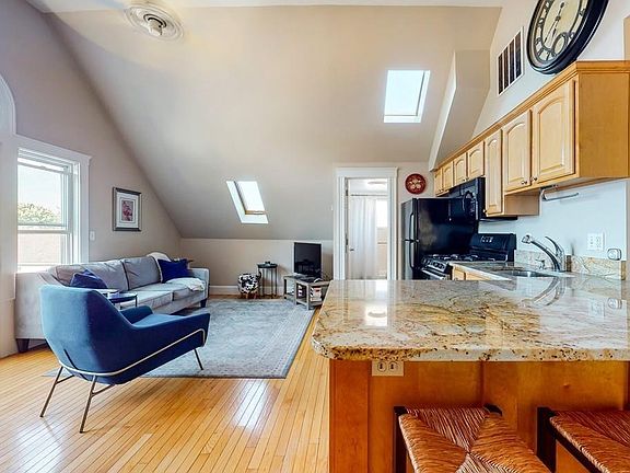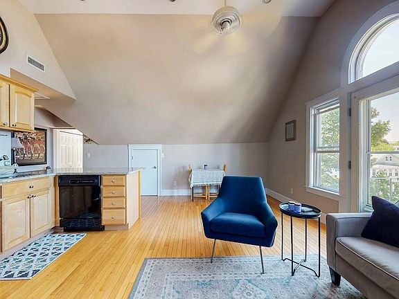 Showings by appointment only. Enjoy treetop and blues sky views from this delightful and light-filled top floor condo. Cathedral ceilings, skylights, and a Palladian window, anchor the open living space combining the living and dining area and kitchen. The updated kitchen is roomy and functional with a large granite counter that can accommodate four stools for casual eating. The bedroom is equally as charming with a large window and another skylight. There is a bonus room with a deep double closet that can be used as a dressing room, guest bedroom, or office. Other standouts include central A/C, pull down attic storage, private storage and shared laundry in the basement, and two-car parking. This East Watertown location is a quick jaunt to Cambridge and around the corner from hot spots like Sofra and Intelligentsia Coffee.
