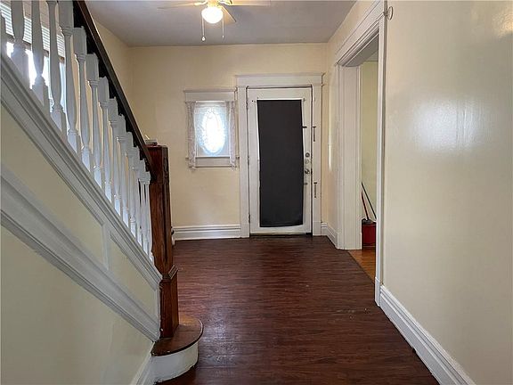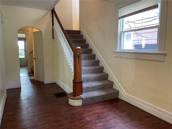 Great space in this 4 bedroom, 1.5 bath colonial on a quiet street on the North Hill of New Castle close to schools! Newer vinyl windows throughout, newer vinyl siding, a high efficiency furnace, and a new half bath on the main floor. Covered front porch to relax this summer, a large deck in the back overlooking the level back yard. So much character and charm in this home! Original hardwood floors in most of the spacious rooms. Huge living room and dining room with built in cabinets. The current galley kitchen could be moved to the 12x11 den to create a large kitchen for the family. Double staircase with access from the foyer and from the kitchen. The updated full bath upstairs has a walk in shower as well as a soaking tub. Nice master bedroom with a bonus walk in closet, as well as 3 additional bedrooms. The walk up attic is a great space for play or just storage. Great family home or investment property.
