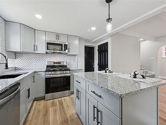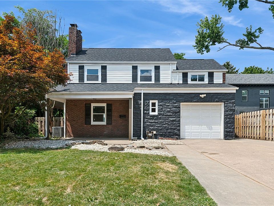 A brick and stone 3 bed, 2 bath home that has been fully updated, and may just be one of the strongest homes around! A concrete interior construction from top to bottom, from subfloors, to the exterior walls, this home was built to last! Make your way inside from the covered front porch to find a wide-open floor plan with all new flooring. A large living room is accompanied by a brand new kitchen featuring soft close, full plywood cabinetry with an island, granite countertops, tile backsplash with backsplash windows and stainless appliances. A formal dining table space overlooks the fenced in backyard and wrap around deck. And if that isn't enough, enjoy covered deck #2 behind the garage! Upstairs consists of 3 spacious bedroom with new carpeting, a primary with cute built-ins and a fully updated bath with tile tub surround, tile floors, an LED mirror and black finishes. Partial finished basement with a brand new full bath with tile flooring and shower surround. Quiet dead end street!