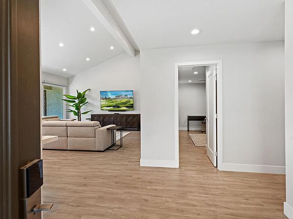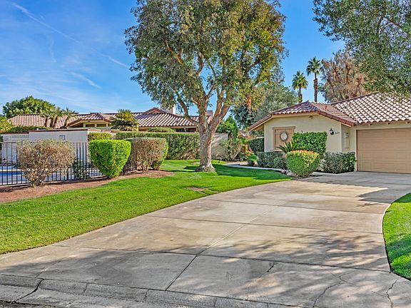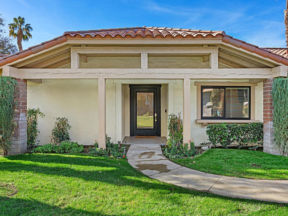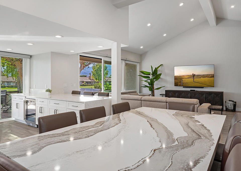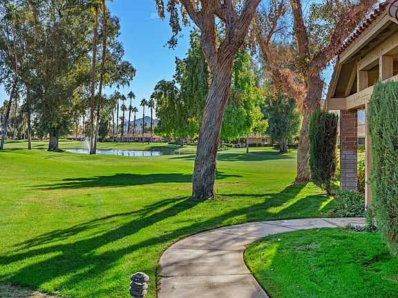 PREMIER LOCATION in Monterey Country Club! Experience unparalleled luxury with BREATHTAKING SOUTH-FACING VIEWS of the pristine golf course, sparkling lake with a fountain, and the majestic surrounding mountains. This modern masterpiece has been completely REIMAGINED and REMODELED with no expense spared, featuring 2 spacious bedrooms, dual offices/dens, and 3 A1/2 elegant bathrooms. The open kitchen is a chef's dream with new custom cabinetry with soft-close doors & roll-out shelves, CAMBRIA QUARTZ countertops, and top-of-the-line appliances. A custom Cambria Quartz top dining table seats 8-10, perfect for large gatherings. New baseboards, flooring, and energy-efficient windows elevate the home's contemporary appeal. Hunter Douglas window coverings add style and functionality throughout. The living room boasts a sleek linear gas fireplace and stunning 180-degree views. The primary suite is a serene retreat with a spa-like bathroom, soaking tub, steam shower, and custom walk-in closet. Even the garage impresses with epoxy floors, a tankless water heater, and ample storage. The entertainer's patio offers ample seating, fire pit tables, and stunning views. Monterey Country Club features 27 holes of golf, 13 tennis courts, 20 pickleball courts, bocce, and 37 pools. Located in the heart of Palm Desert, this vibrant community offers unmatched amenities and lifestyle. Offered fully furnished, this home combines luxury, location, and viewsa"truly the BEST in Monterey Country Club!