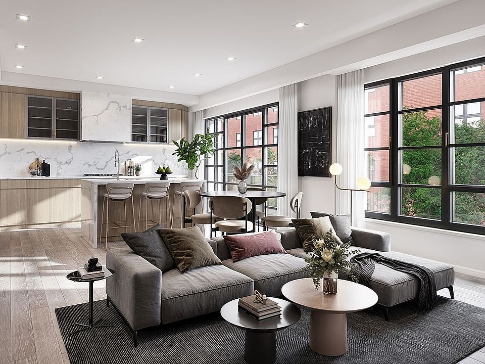 Unit 4A is a 25’ wide floor through home with 2 bedrooms, 2 bathrooms and 1326 interior square feet. Features include floor-to-ceiling windows, northern and southern exposures and a Juliet balcony.
