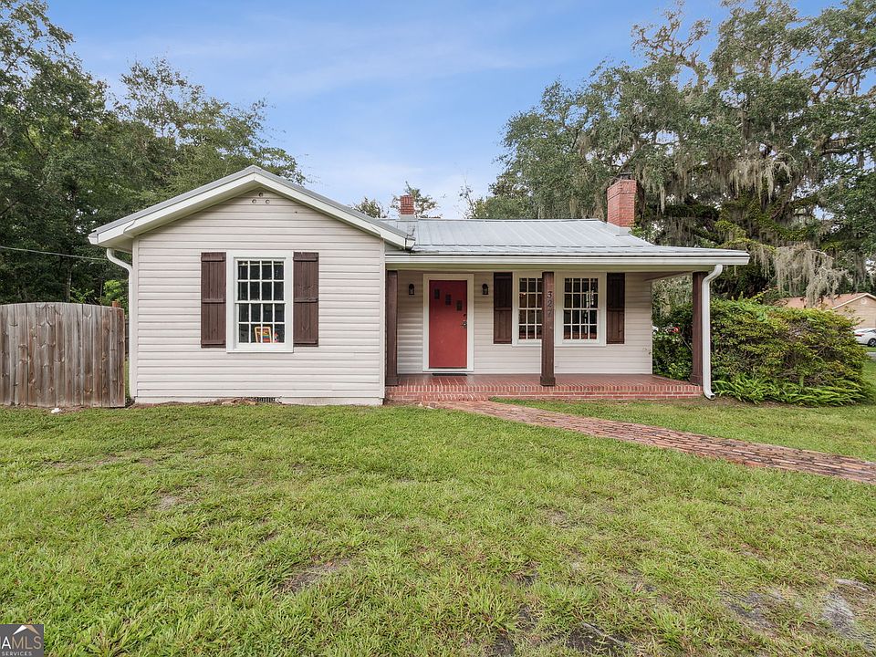 Charming Coastal Bungalow in Kingsland, beautifully renovated and brimming with character! This 3-bedroom, 2-bath home retains its 1942 cottage charm, featuring a stunning original fireplace with a wood mantel, glass doorknobs, a built-in dining room hutch, a 'can pantry' in the kitchen, and much of the original hardwood flooring. The 2017 addition by Terry Stover Construction Company enhances the home with a spacious primary suite, including an extraordinary bathroom with dual sinks integrated into a custom 7-foot barn table, and a large zero-threshold walk-in shower with a bench and glass enclosure. Reclaimed doors in the new addition perfectly blend old-world charm with modern updates. Renovations in 2017 also included a new OVERSIZED two-car garage, new metal roof, updated guest bath tile, new subfloor and flooring, and a complete overhaul of plumbing and most electrical systems. In 2018, the original living room was upgraded with new subfloors featuring a moisture barrier and fresh hardwoods. This home has been lovingly improved, making it a true gem in the heart of Kingsland! Who's ready to LOVE WHERE YOU LIVE?