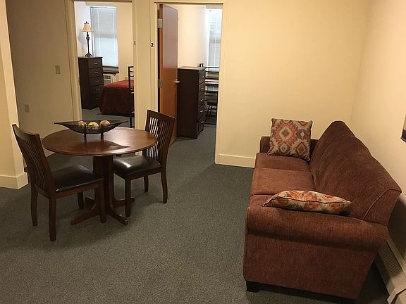 This is a two bedroom apartment. It offers a dining table set, a couch, and two coffee tables. The bathroom has stone flooring, stone countertops, and a mirrored shower door attached to the bathtub. Each bedroom has a double bed, a large closet, a desk set, a dresser, and an air conditioner. The kitchen has a dishwasher, a microwave, and ample cabinet space. There is a stone floor with marble style countertops as well. 24/7 recorded security camera suite from ADT.