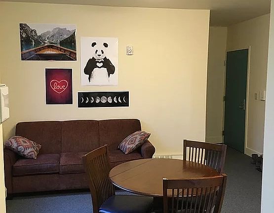 Available for 26/27. This is a three bedroom unit. The bedrooms have large windows, two of which face down Buffalo St, with distant views. Each bedroom has a double bed, a dresser, a desk set, a large closet, and an air conditioner. The bathroom has stone countertops, stone floors, and a mirrored shower door that attaches to the bathtub. The living room has a full-size couch, a table set, air conditioning, and large windows. The kitchen comes with a microwave, a dishwasher, marble-style countertops, and a stone floor. 24/7 recorded security camera suite from ADT.