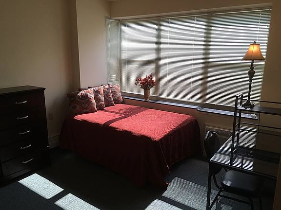 Available for the 25/26 academic year. This is a three-bedroom penthouse apartment. Each bedroom has a double bed, a desk set, and a dresser. The rooms are air conditioned and have large closets. Bedroom #3 has 14 foot ceilings with a ceiling fan and a glass wall that offers fantastic views of Ithaca. The bathroom has stone countertops and stone flooring. There is a mirrored shower door attached to a bathtub. The living room has a full size couch, a table set, and air conditioning. The kitchen has stone flooring, marble-style countertops, a built-in microwave, and a dishwasher. 24/7 recorded security camera suite from ADT.