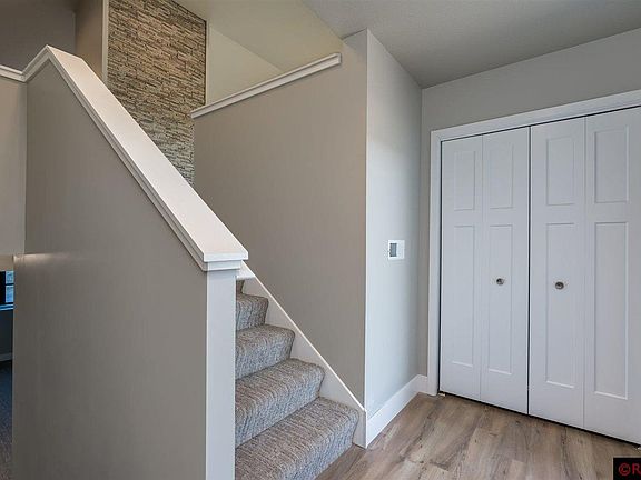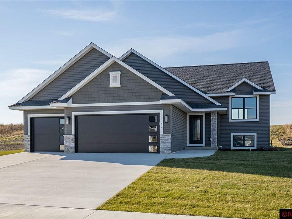 A modern interpretation of a contemporary and artistic design, this new construction is unique and fresh! It begins at the curb, with maintenance free exterior and stone accents that greet you as you ascend towards the entry. Stepping through the front door, notice white enameled craftsman style doors and trim and upscale lighting. Comprised of five bedrooms and three baths, this home is spacious and very inviting. A vaulted living room features an accented stone wall. A utilitarian kitchen with Maple Dusk cabinets, granite countertops, stainless steel Whirlpool appliances, and a pantry. Coffee/wine bar in dining area keep the entertainment flowing. The primary bedroom you'll find a decorative recessed step tray ceiling, walk-in closet, and a designer private en-suite. Laundry is situated on two levels for added convenience. Cozy up to the gas fireplace in lower level family room, also highlighting built-in lighted wall niches for added ambiance. Other notable mentions include: high efficient heating and air conditioning, and Marvin black Low E windows. Triple garage is a spacious 747 square feet and is sheetrocked, insulated and trimmed. Also, features 220 outlet for EV. Privacy berm in the backyard. 12x16 gray composite, maintenance free decking with black aluminum railings to be completed soon! The list truly goes on and this home will make someone very happy!