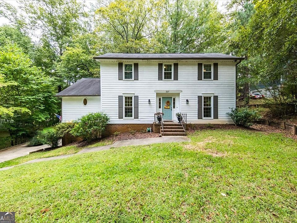 Curb appeal plus so much more! 4 bedroom, 2 bath updated & well maintained. Formal living area or office plus a cozy den with wood burning fireplace. Spacious kitchen with breakfast area. Master suite on the main level. Upstairs features 3 additional bedrooms. Unfinished basement area great for storage or additional living space. Deck overlooks wooded back yard. 2 car garage. Lot backs up to the 1st fairway.