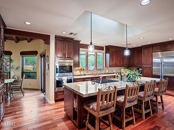 The home is back on the market as the previous buyer had a change of heart. Inspections have been conducted and the home is in pristine condition. This presents a perfect opportunity to buy with confidence, as the home has undergone thouough inspections, ensuring its excellent condition for prospetive buyers. Welcome to the prestigious Catalina Ridge Estates in the luxurious gated Cobblestone community. This exquisite property boasts luxury living at its finest, with four spacious bedrooms, and four beautifully appointed bathrooms, all situated on just under an acre of stunning desert landscape. This home is the epitome of elegance with Santos Mahogany wood flooring, Typhoon Bordeaux granite countertops in the kitchen w/ exaggerated 12' center island, designer appliances, custom 117 wine wall by Lost Barrio and a breakfast nook with the most gorgeous mountain view- see the features and upgrades list! Interior offers a seamless blend of contemporary design and timeless sophistication. The roomy floor plan seamlessly connects the living spaces, creating an inviting atmosphere for both relaxation and entertainment. You'll never want to leave this backyard with the breathtaking infinity pool and spa with stunning water feature which is fully automated by remote operation! This gorgeous landscaping creates an ideal setting to bask in the Arizona sun while enjoying panoramic views of city lights and majestic mountains. Whether you're hosting gatherings or seeking a private retreat, this outdoor oasis is sure to impress. This is a rare opportunity to own a piece of desert paradise in an exclusive community! Experience the ultimate in luxury living where every detail has been meticulously crafted to provide a lifestyle of unparalleled comfort and sophistication!