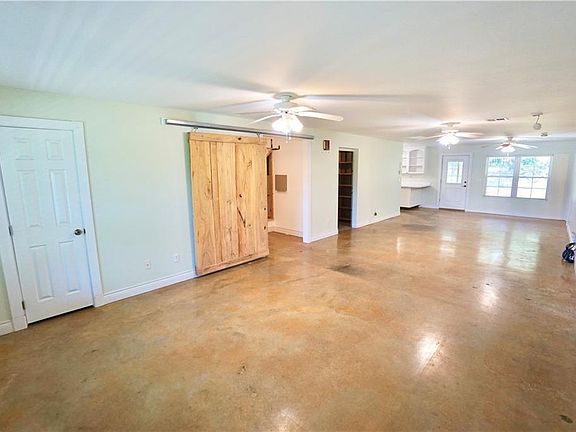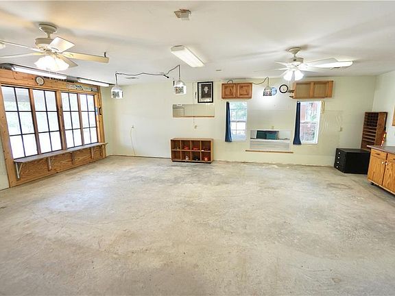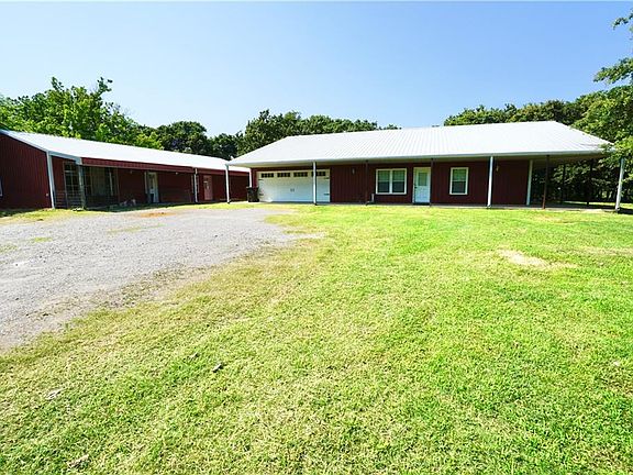 Acreage that fronts to Shawnee Lake. This is a metal red barn home with a wrap around porch. It is a multi-generational home. The home has two bedrooms, two baths (one is 100% handicap access), kitchen w/ walk in pantry. Sun room attaches to additional studio apartment that has small kitchen, living area, two bedrooms and huge workshop/studio. Home has additional shop. Concrete floors through-out.