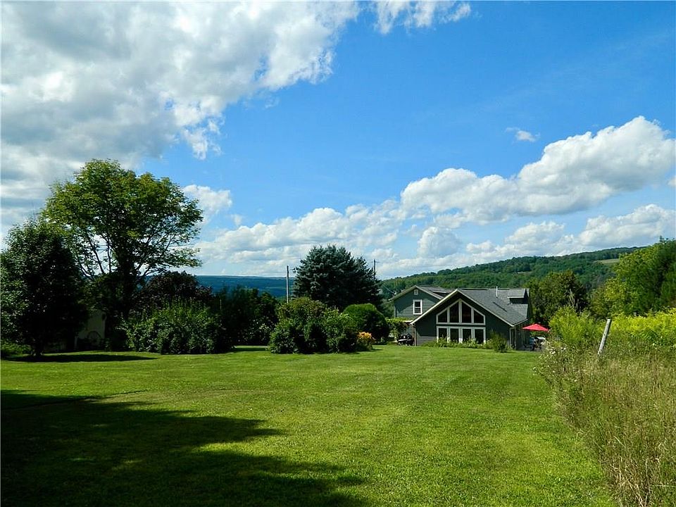 Overlooking scenic vineyards, historic Esperanza mansion and the sloping hills of Keuka Lake, on almost 12 acres, this 3 bdrm 2 fba home is a marriage of both classic country charm & modern conveniences. Kitchen fitted with custom Maple cabinets & island w/sink. Stainless steel appliances include Bosch, GE & Kenmore. Greatroom with wall to wall windows with a deck on the east side and vine shaded pergola patio to the west. New windows throughout and Andersen sliding doors.First floor bedroom and den with Master Suite & 3rd bedroom upstairs. Energy-efficient, low maintenance, Geothermal system provides economical heating & cooling. New Goulds water system, new roof in 2011. Two outbuildings just steps from the house. Launch your boat from nearby Keuka Lake State Park. A wonderful property!