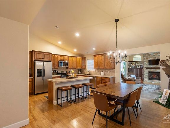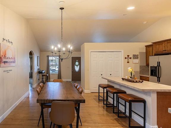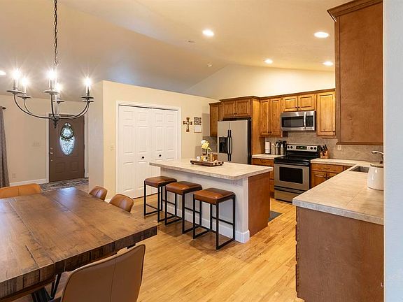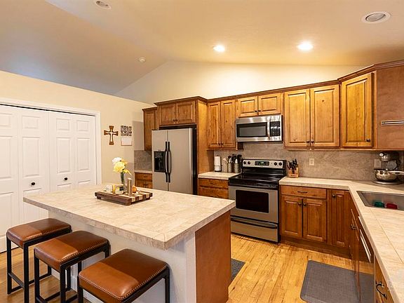 This beautifully maintained custom home offers comfort, space, and thoughtful design throughout. Step into the welcoming entry, where a cozy sitting area doubles as a reading nook or quiet retreat. The kitchen features ample cabinetry, a large pantry, tiled countertops, and a breakfast bar perfect for casual dining or entertaining. The adjacent dining space comfortably fits a large table for hosting. The great room is a true showstopper with vaulted ceilings, a striking stone fireplace, and floor-to-ceiling built-in shelves—spacious, bright, and ideal for gatherings. A split floor plan ensures privacy, with the master suite set apart from guest rooms. The master is a true retreat, complete with two separate bathrooms—one a full bath, the other a 3/4 bath with handicap accessibility. Both feature bidets, and his-and-her closets offer ample storage, including a built-in ironing board discreetly tucked away. Outside, enjoy sunsets and mountain views from the large deck, soak in the hot tub, or relax under the shaded pergola. Abundant windows throughout fill the home with natural light, creating a warm and cheerful atmosphere you’ll love coming home to.