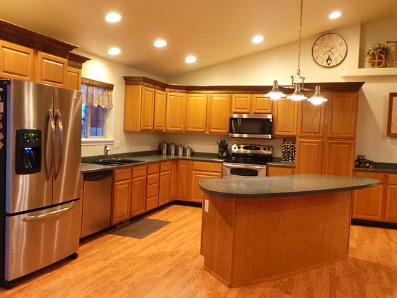 Open floor plan with vaulted ceilings, and a lot of windows for mountian views. Home has central heat/air with an electric heat pump. Main floor has 2 bedrooms, office with outside entrance, 2 baths, and laundry. Vaulted Master suite has a jacuzzi corner tub, and walk in closet. Set up for a basement apartment or can be all one home. Basement has small kitchen with full sized appliances, one large bedroom, full bath, and separate washer dryer. Landscaped rock wall with driveway to daylight basement. Mature trees and lawn.