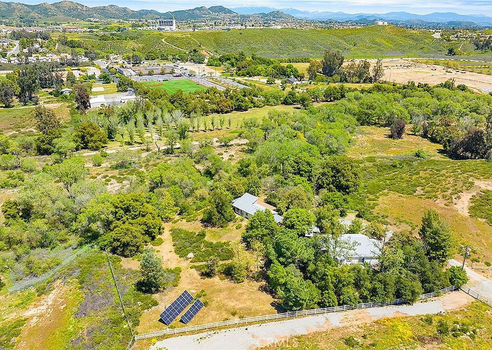 ONE IN A MILLION OPPORTUNITY! …TWO HOMES AND A RUNNING CREEK ON THIS 3.41-ACRE OASIS IN A SHOCKINGLY CONVENIENT LOCATION! Be one of only a few fortunate homeowners to own a residential retreat with acreage off the convenient, centrally located Clinton Keith Road on the border of Wildomar and West Murrieta at the base of the Santa Rosa Plateau. Not only is this a beautiful and usable wonderland for agriculture, horses, playgrounds, etc, but it is full of mature trees and hosts a creek with year-round running water, inspiring sights and sounds which are simply spellbinding. Just moments from the 15 Freeway and every convenience of town (literally 3 minutes to restaurants, schools, and shopping), you will enjoy all the benefits of city living, while being able to, within minutes, retreat to your private natural sanctuary. Sit quietly and listen to the sounds of running water and local wildlife, who come to feed at the babbling brook right on property every day. This unique property includes TWO HOUSES! Live in one and rent the other, rent them both, or make both homes a part of your personal retreat. HOUSE 1: 1270 sf with 2 bedrooms and 2 bathrooms. HOUSE 2: 1074 sf with 2 bedrooms and 2 bathrooms. Both homes have new 2023 roofs, large covered patios with 50-Amp electrical outlets, water filtration systems, electrical performance meters, wifi irrigation timers, and other thoughtful amenities to keep energy costs low . Shared by both homes are an RV hookup, paid-for solar with new inverter, excellent water well with new pump, whimsical walking paths, and a picturesque scene straight from a Hallmark movie – a sitting area under the canopy of a massive ancient oak tree next to the running stream. Keep this charming property as it is or build your dream house, as you let the land and nature speak to your soul. As an added bonus, if you can tear yourself away from this haven, drive just a few minutes up the hill to the 1000s of acres of the Nature Reserve and hiking trails of the Santa Rosa Plateau. This magical property must be experienced with all of your senses to be believed! *****Note that you may enter Jerome Lane through the adjacent neighborhood if you want to avoid Rancho Mirlo (dirt road off Clinton Keith). Nearby are schools, restaurants, hospitals, grocery stores,15 Fwy & the famous Temecula Wine Country. …All less than 1.5 hours from LA, SD, OC, Palm Springs & Big Bear.
