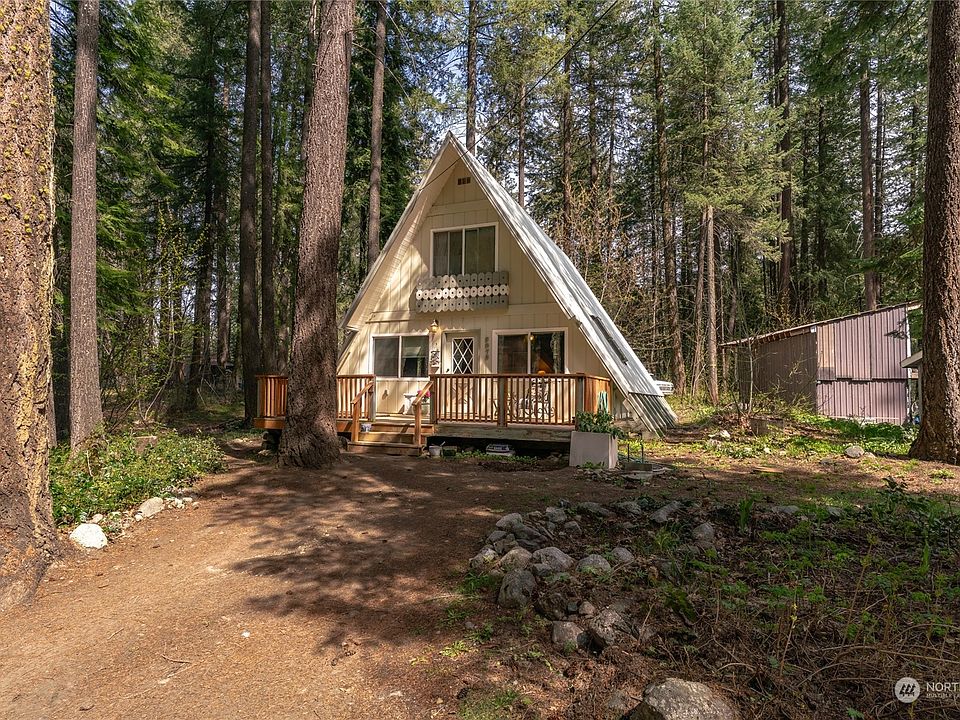 Escape to this charming A-frame home nestled among the pine trees. Embrace the warmth of the pine-planked living room with a crackling wood-burning stove, perfect for cozy gatherings with loved ones. Main level boasts open living and dining room, spacious kitchen, utility room & primary bedroom. The upper level offers two additional generously sized bedrooms for guests to spread out and relax. Updates include low-maintenance vinyl plank flooring & vinyl windows throughout. Large 0.34 acre level lot, storage shed & circular driveway. The Valleyhi Community amenities feature spacious park, playground & swimming pond. Perfect for a full-time residence or vacation getaway just 15 minutes to Leavenworth and Cashmere and 30 minutes to Wenatchee.