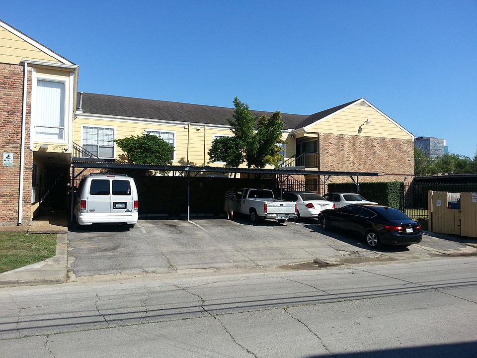 2nd Floor Unit withing easy reach of Public transport. 1 block from the Houston Farmer's Market and 2 blocks from Kirby. Tiled living area with carpeted bedroom. All appliances supplied with a shared FREE Laundry Room. Covered parking for 1 off street. Security cameras and gated entry.. Available beginning/mid October. Owner Pays Trash, Water and Gas. Tenant pays Electric