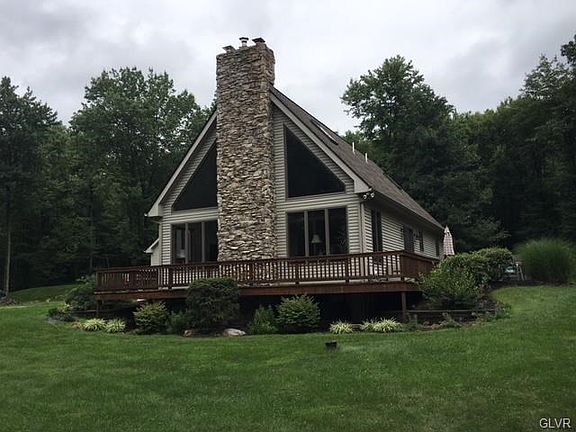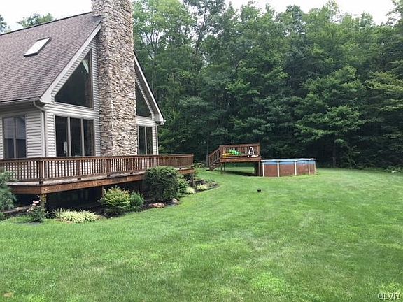 Privacy! Very nice A Frame home with decks and a patio tucked into a mostly cleared 3 acre lot, surrounded by trees, with State Game Lands to the rear. The pictures can't describe this home: the living room has a cathedral ceiling, and windowed front wall that will take your eyes away from the television. If you want garage space there's plenty of it. TWO detached 2 car garages, one with a loft for storage. You won't be disappointed. Come home to your very own hideaway!