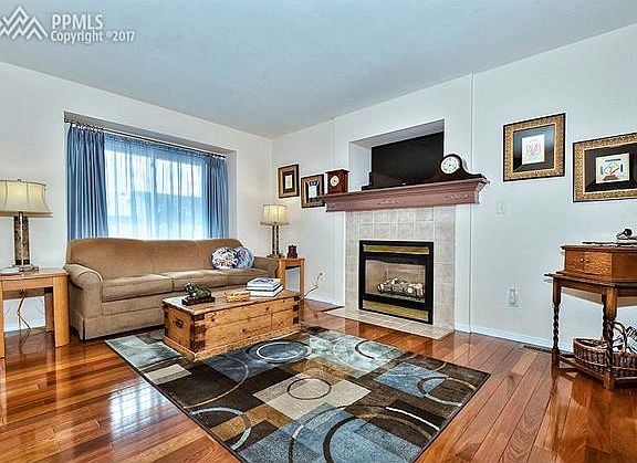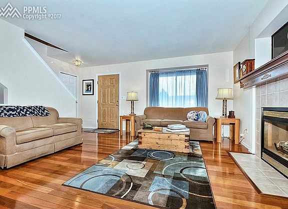 Immaculately updated! Granite counters throughout, Bella hardwood throughout the main level. The custom kitchen boasts granite counters, glass tile back-splash, stainless appliances, double oven and convection microwave. Main level living room with a gas fireplace, separate dining with a walk-out through French doors w/built-in blinds. Huge master suite with a walk-in, updated master bath, double vanity, custom shower, rainfall shower head and body sprays. Two secondary beds up w/remodeled full bath, granite counters. Fully finished basement w/one bed, family room and full bath. Large rear composite deck, 320 square feet in total and the hot tub is included. Fully landscaped w/sprinkler system and planting beds. Across the street from and views of the Springs Ranch golf course. All appliances stay to include the washer and dryer.