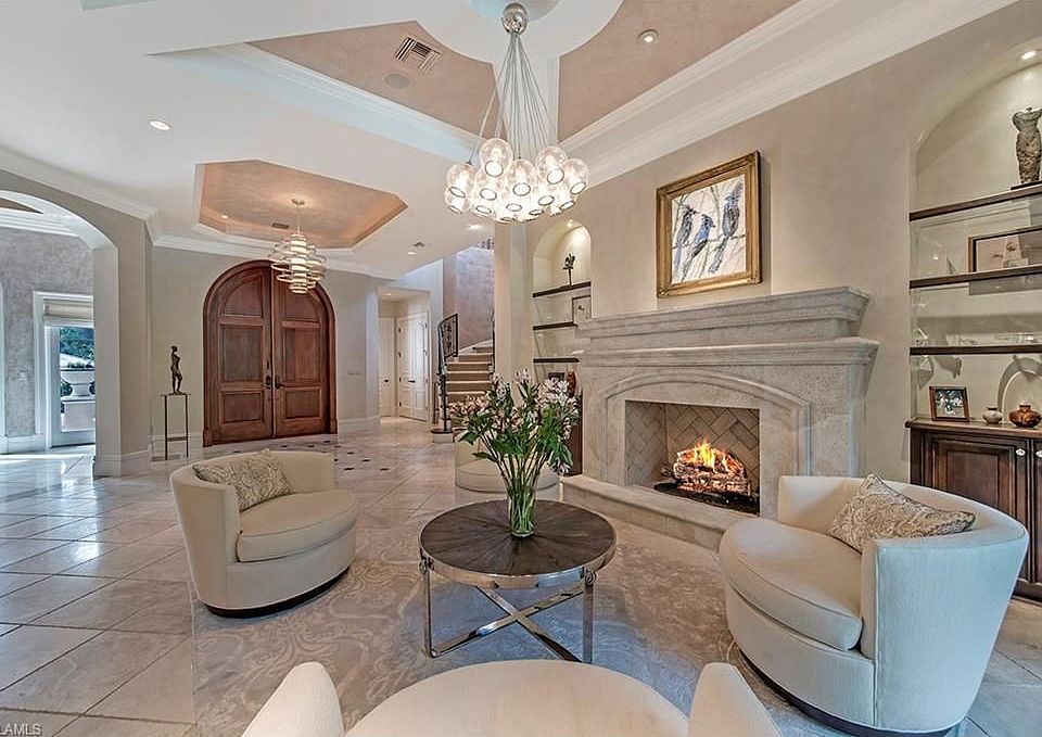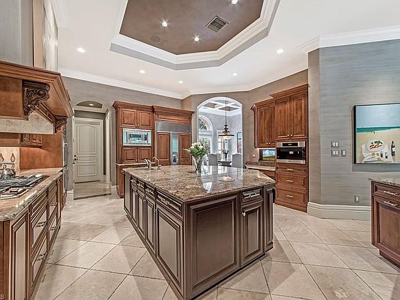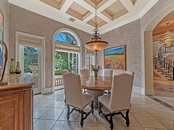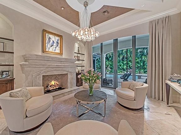 H.11994 Sophisticated elegance describes this beautifully updated Moorings home with 5+den/4 full, 2 half baths and 5,021 sq. ft. of living space. The dramatic foyer, which opens to a statement-making formal living parlor, looks onto the lush outdoor pool/spa area. A large gourmet kitchen boasts high-end appliances, huge island, planning desk, large eat-in area, pantry, and opens to a spacious great room area with built in window seats for lounging. Pocketing sliders along the family room fully open offering a beautiful entertaining flow onto the extravagant private outdoor living area complete with kitchen, separate pool bath, fireplace, screened dining and water feature. The owner's suite, located on the first floor, has a cozy sitting area, dramatic ceiling treatment, handscraped plank flooring, his and her counter areas, water closet with bidet, and marble and natural stone accents. The second floor boasts two en suite bedrooms with balcony access, & another currently being used as an exercise room. This home is moments away from world-class upscale shopping and dining at Waterside Shops and Venetian Village and the white sand beaches at the private Moorings Beach access.