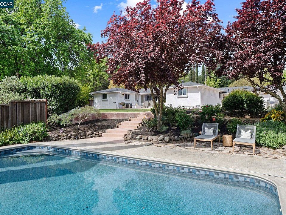 Set far off the road on a private, sunlit .45-acre lot in Lafayette’s desirable Reliez Valley, this beautifully updated home blends modern style with relaxed charm—framed by stunning Mount Diablo views. Inside, vaulted ceilings, engineered hardwood floors, and an open floor plan create a light, airy feel. The chef’s kitchen features sleek finishes and premium appliances, including a Miele dishwasher, Electrolux induction range, and wine fridge. Four spacious bedrooms, 2.5 bathrooms, and a cozy home office provide comfort and flexibility. Step outside to a true backyard retreat: expansive patios, level lawn, raised garden beds, a chicken coop, and lush landscaping surround a sparkling pool and multiple seating areas. Just steps from Brookwood and Briones parks, and minutes to downtown Lafayette and Walnut Creek. Top-rated Lafayette schools and quick access to Hwy 680/24 make this a rare opportunity to enjoy the best of East Bay living.