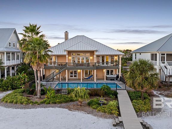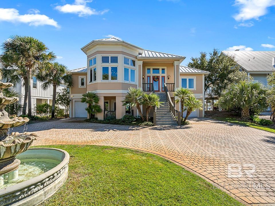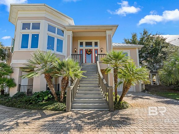 Unobstructed water views, comfortable luxury, and a layout designed for everyday coastal living coming together seamlessly in this well-appointed waterfront home. Located on Ono Island, a private gated community within Orange Beach, the property overlooks Old River the protected shoreline of Perdido Key State Park.As soon as you step inside, walls of windows pull your attention straight to the water, while natural light enhances the open layout. Home has two new HVAC systems and New appliances in 2024. Tall ceilings with crown molding elevate the living area, centered by the wood-burning fireplace and custom built-ins. The kitchen, dining, and living spaces flow easily and create a great space for entertaining or relaxing. The primary suite offers private deck access and a peaceful retreat with natural views. Two additional bedrooms are located upstairs, while the lower level includes a guest bedroom and full bath alongside a spacious bonus area for flexible use! Outdoors, enjoy deep-water access, private boathouse with ThruFlow deckings, a 12,000lb lift, and a large outdoor, gunite, swimming pool. New Impact Rated 165 mph windows 2021, all new soffits 2021 and the hot tub is included! Property also includes a heated and cooled workshop. Make this exclusive, water-front home, yours today! Buyer to verify all information during due diligence.