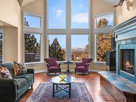 Located on highly-coveted Starview Drive on Awbrey Butte, this stunning home offers premiumfinishes with panoramic Cascade Mountain views. Special touches include Brazilian Cherryhardwood flooring, coffered ceilings in the kitchen and formal dining area, and extensive crownmolding and stonework throughout. In the living room, vaulted ceilings and floor-to-ceilingwindows let in abundant light and afford breathtaking mountain views. Enjoy a gourmet kitchenwith multiple pantries and high-end appliances including a Sub Zero refrigerator, Dacor 5-burnercooktop, and Wolf microwave, wall oven, and warming drawer. The primary suite offers a jettedtub, heated tile floors, and a spacious closet with built-ins. Soak in the incredible views frommultiple decks with Trex decking on the upper and lower floors. Additional features include atheater room, spacious upstairs office with mountain views and custom built-ins, a downstairsliving area with gas fireplace, and generous storage space.