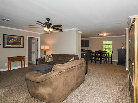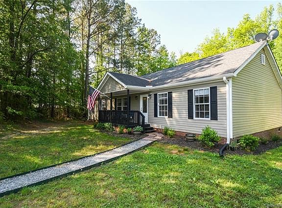 One story home on a wooded 2.4 acre lot. This home has a spacious master bedroom w/en-suite that has a large garden tub, separate shower and double sinks. Open floor plan with split bedrooms. Kitchen has plenty of cabinets with newer appliances, refrigerator included. Cute front porch with plenty of privacy surrounded by nature. This home want last long come check it out this weekend! Storage building does not convey.