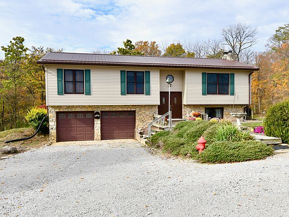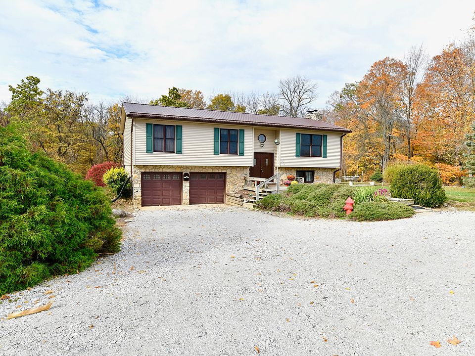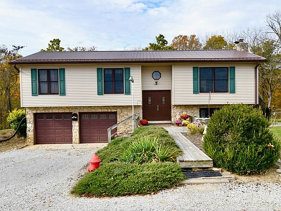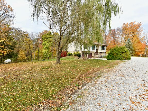 Welcome home to your personal private country get-away where you have a barn, pasture space/cornfield, a creek, acres of mature trees, plus gorgeous views all around on this sprawling 9.9 acres property. This bi-level home offers an updated kitchen, formal dining room, tons of windows, living room, family room, wood burning fireplace, wood burning stove, 2.5 bathrooms, 3 bedrooms, walk-out basement, oversized garage, and so much more! Home is being sold AS-IS. Start & end your day on the sizable back deck enjoying the wildlife, creek, or just enjoy the peace & quiet. This home has everything you need to achieve your quiet country lifestyle with easy access to the city!