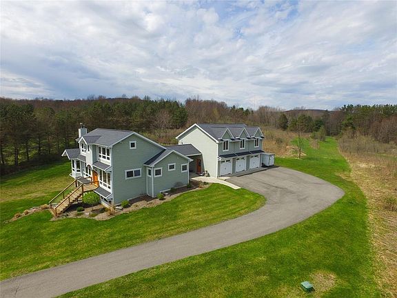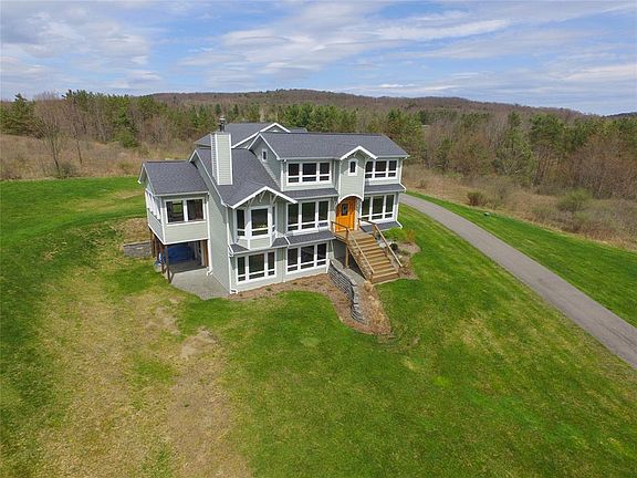 Absolutely Stunning one owner Contemporary with the perfect mix of rustic and modern flair. Tons of privacy and beautiful views from every window. Fantastic cooks kitchen with granite counters, high end appliances and a large pantry. Open concept kitchen, dining room and great room. First floor master suite connects to laundry room. Large mudroom, home office area and half bathroom. Second floor has two bedrooms and a full bathroom. Newly finished walkout lower level with family room, two bedrooms and a full bathroom. Huge three car garage with 672 square foot workshop on the second floor. Situated on a gorgeous 5.3 acre lot with hiking trails, a short walk to the Aqua Terra Park and only a short drive to Binghamton. This house has so many beautiful features and is a must see property.