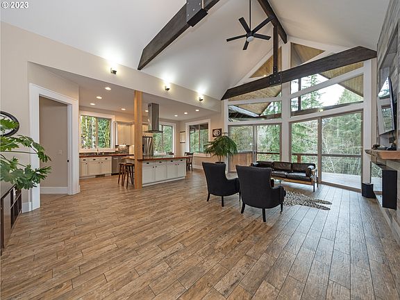 Welcome to your private oasis on 6 acres of wooded bliss! This custom-built home is a testament to quality craftsmanship and attention to detail. The heart of this home is the thoughtfully designed kitchen with a custom island, modern appliances and porcelain tile floors. The main floor great room is enhanced by its soaring vaulted ceiling, electric fireplace and amazing views out the double set of sliding doors. The primary suite is a retreat within itself, featuring an ensuite bathroom with heated tile floors, walk-in shower and walk-in closet. The lower level offers multi-generational possibilities with 2 bedrooms, 1 bathroom, family room w/electric fireplace, laundry room, wet bar area wired and plumbed for future kitchen, additional area wired and plumbed for future sauna and 1 car garage. Bonus amenities include heat pump, central vac, 2 electrical panels with generator hookup, laundry hookup on both levels. Outside you'll find the expansive reclaimed wood deck with a spectacular view of your very own forest from the hot tub. As you explore the property, you'll discover walking trails and a small creek. The possibilities for outdoor recreation and relaxation are endless. Located just minutes from downtown Scappoose and a 20-25 min drive to Hillsboro or Portland! View video walkthrough tour to fully experience the property.