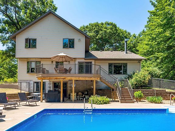 Fantastic home on 10 wooded acres located between Osceola & Somerset. Many upgrades including a gorgeous owner's suite addition with massive bathroom and walk-in closet. Other updates include new pool liner and pump, new deck boards and railing, new AC ('22), new pressure tank ('19). Close to all of the city amenities with a quiet rural setting! Spacious maintenance-free deck area overlooks the beautiful pool and is the ideal entertaining hotspot. Kitchen is a chef's dream with high end cabinetry and solid surface counters. The upper level features a 2nd bedroom with massive walk-in closet and a junior suite complete with 3/4 bath. Main floor laundry has built in cabinets. Beautiful wood work throughout the home completes the cozy atmosphere of the delightful home. 34x60 pole building has working 200amp and gas stubbed in for future heat.