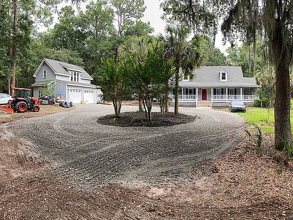 3 bd 2.5 bath farmhouse with wrap around porch and circle driveway. Separate mother in-law suite above a detached 2 car garage. Property also includes an additional storage outbuilding, 3 separate pastures with electric fencing for horses and a retention pond with dock. All situated on roughly 6.45 acres with 445 feet of frontage on Brickyard Point Road South.