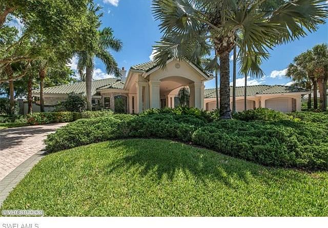 H.9366 - New Roof Scheduled for November. This impressive estate home is located in the exclusive community of Audubon Country Club & is privately sited on a large lot with sweeping lake views overlooking the 14th & 15th fairways. With an open floor plan, 5,783 square feet under air & 9,500 sf total, 3 bedrooms in the main house & a separate guest house with living area, this exquisite home has room for all your guests. Features include pool/spa, Saturina marble & wood flooring, plantation shutters, tray ceilings, columns, storm shutters, Vantage lighting system, paved circular drive with porte-cochere & much more. Living room has a gracious gas fireplace, volume ceiling with deep coffers & built-in cabinets. A spectacular library has cherry built-ins & an octagonal cedar ceiling. Kitchen is equipped with raised panel cabinetry, a breakfast wet bar with wine cooler, desk & bookcases. Master suite has large seating area, beautiful built-ins, his & her vanities plus marble shower. Audubon sited on 770 acres offers golf, tennis, championship croquet courts & community pool. A complete renovation of club house & pool area was completed in 2014. West of US41, 2 miles to Gulf beaches.
