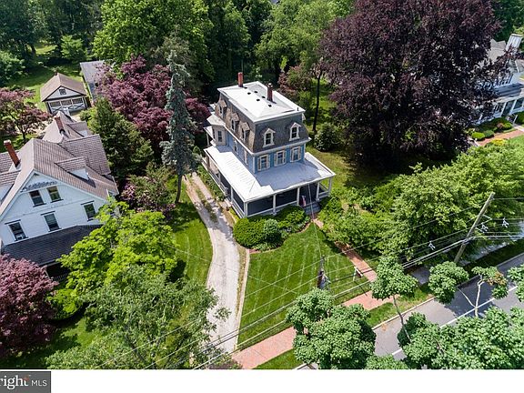 On the market for the first time, this gorgeous Second Empire home presents a unique opportunity to own a piece of Moorestown's history! From the lovely wrap-around porch, enter into a stunning center hall. The formal living room boasts 10' ceilings and spectacular hardwood floors that carry through to the family and dining rooms. A delightful bay window, original plaster moldings, and coffered dining room ceilings are just some of the historic details present in this lovely home. The large eat-in kitchen features a charming vintage gas stove, access to the back deck and yard, and convenient first floor laundry hook-ups. Also on the first floor is a newly updated powder room tucked under the stairs. On the second floor, two adjacent rooms connecting to a full bathroom present the opportunity to create a master suite with a sitting or dressing area. Two additional bedrooms and a vintage tile bath compete the second level. On the third floor, you'll find a large library, a study, and a nicely-sized bedroom. Out back, a barn and carriage house offer the perfect space for additional storage or to use as a workshop or hobby space. Behind the carriage house and barn is a large, private yard which would be perfect for a pool. Additional features of this magnificent home include a new hot water heater, new interior painting, and a new top section of the roof. Bring your ideas to this home's spacious, flexible floor plan and adapt it to your exact needs and wants!