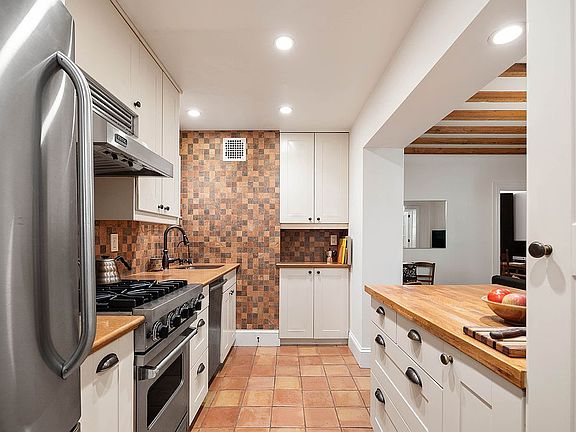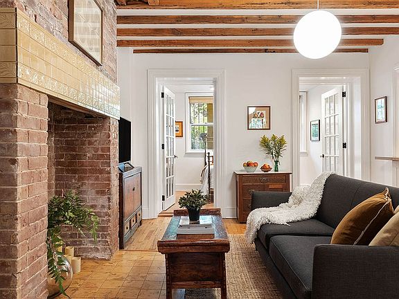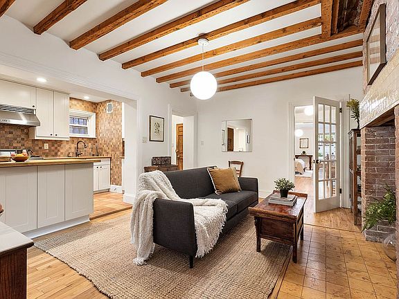The French countryside comes to Clinton Hill in this magical 2-bedroom garden gem situated in an elegant and wide brownstone on Mansion Row, just a few blocks to Fort Greene Park and the award-winning restaurants and amenities on Dekalb avenue. Set back from the leafy green streetscape of Clinton Avenue by a deep front garden, this wonderful home offers privacy, quiet, a pastoral setting in front and in back, and is awash in period details at every turn. A large private garden accessible only to this unit has been lovingly tended over the last two decades and offers the sweet sounds of a burbling brook and waterfall, new soil going down at least a foot for vegetable gardeners, perennial plantings, a flowering apple tree, electric and water hookup, and wonderfully aged stonework perfect for furniture placement. The interior is as enchanting as the outdoor space and offers high ceilings accented by rustic exposed beams, hardwood floors, an oversize exposed brick hearth with decorative ceramic tiles in the living room, an original marble mantle in the primary bedroom, and ceiling and base moldings throughout. Impeccably maintained over the years, this extra-wide and deep full-floor is currently configured with 2 bedrooms, one in front and one in back, separated by a home-office space in the middle complete with a wall of built-in bookshelves. A cozy living room opens out from the chef's kitchen, and a separate dining area off the back leads right into the private garden. A spacious and sophisticated windowed Provencal-style kitchen awaits your inner chef with white Shaker-style cabinetry, terracotta floors, oil rubbed bronze faucet and hardware, and a Viking professional range, Miele dishwasher and large GE fridge. In addition, a butcher block countertop sits atop a prep island providing the perfect amount of separation from the living room, and great work space for your everyday needs. A comfortable dining nook in the back includes a built-in sideboard for extra storage and is the perfect spot to enjoy a pleasant breeze from the garden while entertaining. The comfortable entrance hall includes a deep hallway closet for everyday storage and allows you to put everything away before entering the stylish living room complete with homey details dating back to the turn of the century. Place your sofa to have a view of the oversize hearth, while also getting light from both East and West exposures. A bedroom off the back allows for a peace and tranquility rarely experienced in the city and ensures waking up to the sounds of the birds in your enchanted garden. The front bedroom is a dramatically-proportioned space with a walk-in closet with lovely French doors and is large enough to accommodate a king-size bed, additional furniture, even a second home office area. Or use the back bedroom for sleeping and the front bedroom for an additional formal living room. The possibilities are endless! The bathroom was recently renovated in a timeless classic palette that includes real onyx walls with a matching custom vanity top chosen from the same quarry, undermount sink, rich dark green ceramic floors, an elegant console sink with oil rubbed bronze fittings, and a glass-enclosed soaking tub and shower. A large medicine cabinet affords great storage too. This human and pet-friendly well-established co-op includes a free washer and dryer in the basement and has a new roof, boiler as of about 7 years ago and new gas lines as of about 4 years ago. The apartment also comes with a very large area in the basement designated for additional storage. The co-op allows split AC units to be installed by owners. This charmer is not to be missed.