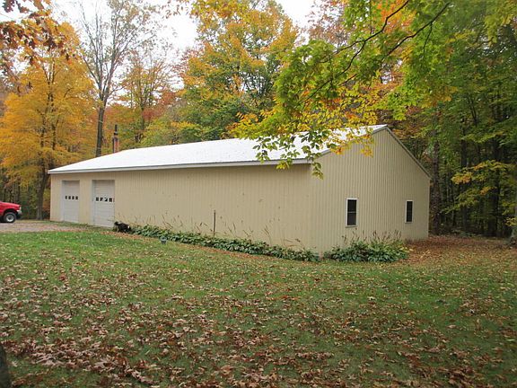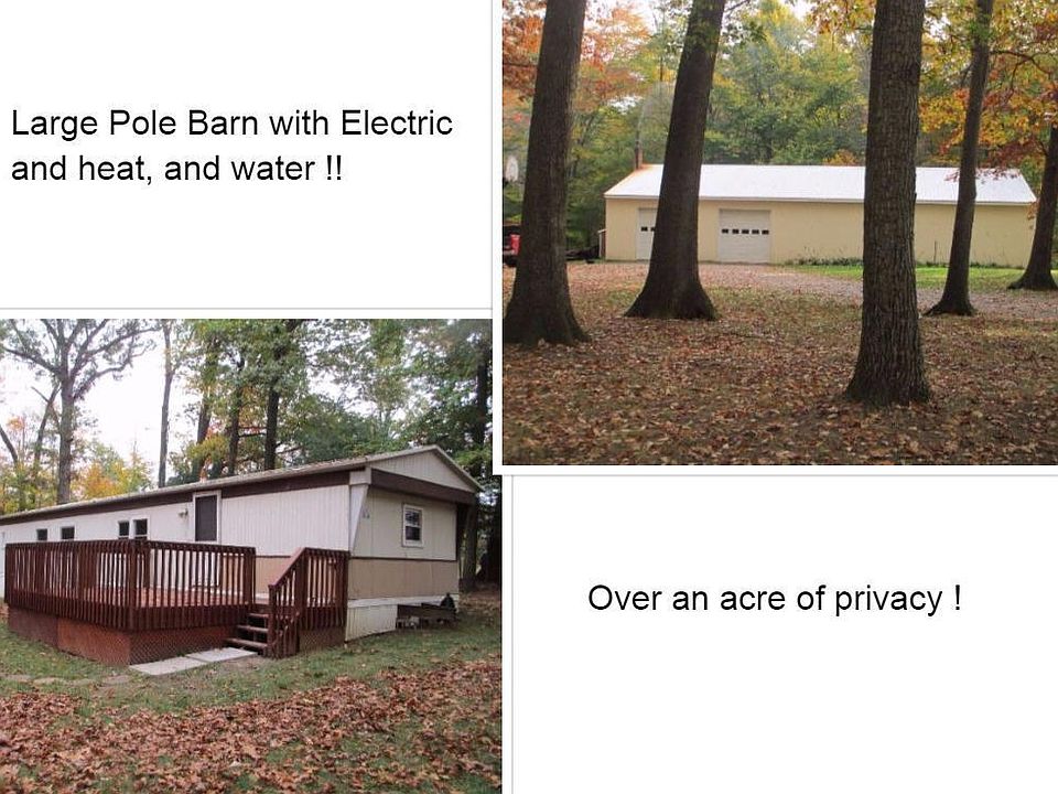 Attention Car Buffs !! This home has a HUGE pole barn (40'x80'!) It is heated with 2 sources, oil and wood. Well insulated in ceiling and walls. 220 and 110 lights. Overhead doors apprx 10' high and 12' wide. Mobile home has 3 bedrooms, 1 bath, well and septic. Pole barn has seperate well with heated water. All of this is on over an acre of privacy! Possible Owner financing or Rent to own !