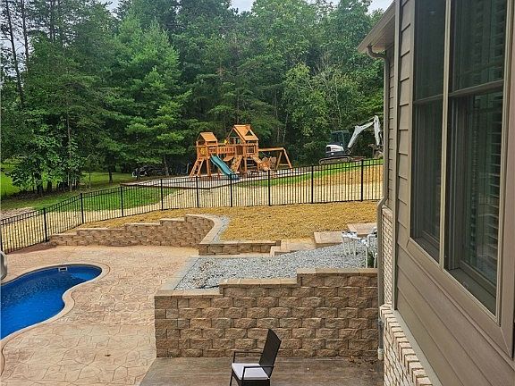 DHB custom home built in 2021 offers a blend of rustic appeal and modern comfort. The soaring ceilings and magnificent 2-story stone fireplace create a grand ambiance, while the stunning catwalk overlooking the great room adds a touch of elegance. Large windows flood the space with natural light. The chef's kitchen is complete with all the extras making cooking a pleasure as you overlook the great room, allowing you to engage with family and friends. This area flows out to a spacious composite deck where you can enjoy views of the pool and surrounding woods. This home is perfect for both intimate family gatherings and entertaining guests. On the lower level you'll discover a space to gather with friends equipped with a wet bar. This area flows out to the pool where stamped concrete adds a touch of luxury. The heated pool is equipped with a tornado slide, water fountains, tanning ledge. And for the little ones, there is a dedicated playground. This custom home truly has it all!
