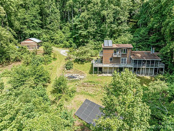 A remarkable ~27.7 acre mountain paradise with a pond, creek, garden, greenhouse, chicken coop, barn & workshop! Delight in the peacefulness of spring-fed ponds and the soothing sounds of Martins Creek. Enjoy 5KW photovoltaic solar system & solar hot water heater. The proximity to Pisgah National Forest and scenic walking trails will captivate nature enthusiasts. With a south-facing orientation, abundant sunlight graces the property, nurturing mulberry, paw paw, cherry, apple, blueberry & honey berry bushes. Unleash your creativity on the nearly finished tiny house and partially finished basement apartment, awaiting your personal touch for additional revenue streams! The property includes a separate creek front lot and multiple build sites, providing opportunities for community and growth. A permaculture plan, expertly designed by Zev Friedman, is thoughtfully incorporated into the property. Uncover the possibilities that await you in this idyllic homesteading haven!