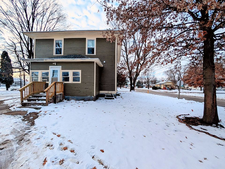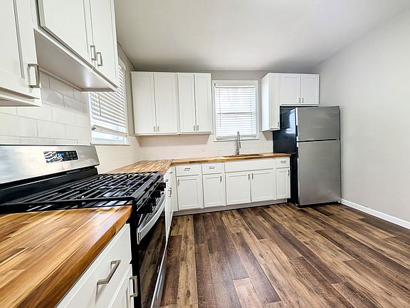 Updated 2 bedroom, 1 bath duplex with a practical layout and a fresh, clean feel throughout. The living room is bright with large windows and durable LVP flooring that runs through the main spaces. The kitchen has white cabinets, butcher block counters, subway tile backsplash, and newer stainless steel appliances including a gas range and full size refrigerator, plus space for a small dining table. Both bedrooms are nicely sized with good closet space. The bathroom is fully renovated with a tub and shower surround, modern fixtures, and a wide vanity for storage. An enclosed entry or mudroom offers laundry hookups and extra storage. Large yard, off street parking, and a convenient location near local shops and services. Parking and access is in the back, garage included in the rent!
