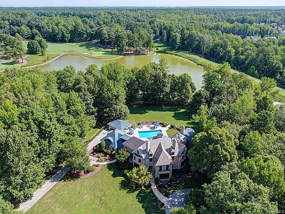 French Country estate designed by Mark Spangler overlooks the 2nd hole of Sabot course at Hermitage CC and fronts the large lower lake. Finest old world design features w/exceptional craftsmanship, materials, & design! Slate roof, limestone exterior accents, 20' x 40' Gunite pool w/Aqua Brite coating & a pool house w/2 dressing rooms, all surrounded by an impressive Tenn. sandstone terrace & handsomely fenced w/steps to the manicured yard overlooking the lake. Inside features a magnificent floating staircase in the foyer, an impressive mahogany paneled office/library w/built-ins & a fireplace, & a spectacular 2-story great room w/a mahogany coffered ceiling, a floor-to-ceiling French limestone fireplace, wet bar, balconies & a 2-story wall of windows overlooking the terrace & pool complex. Cook's kitchen! Private 1st floor owners' suite features a gas fireplace, French doors to the terrace, luxury bath, & 23' x 11' closet w/spiral staircase up to an additional storage room/office or Bedroom #6. Also upstairs are 4 additional bedroom suites, a huge rec room at the top of the back staircase, an exercise room, & balconies overlooking the great room. Huge third floor playroom/storage!